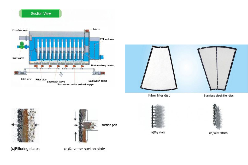 This rotary disc filter consists of multiple filter discs arranged horizontally, each with a fan-shaped filter plate covered by a fiber filter cloth with 10 μm openings. Its operating procedures involve filtration, backwash and sludge discharge.